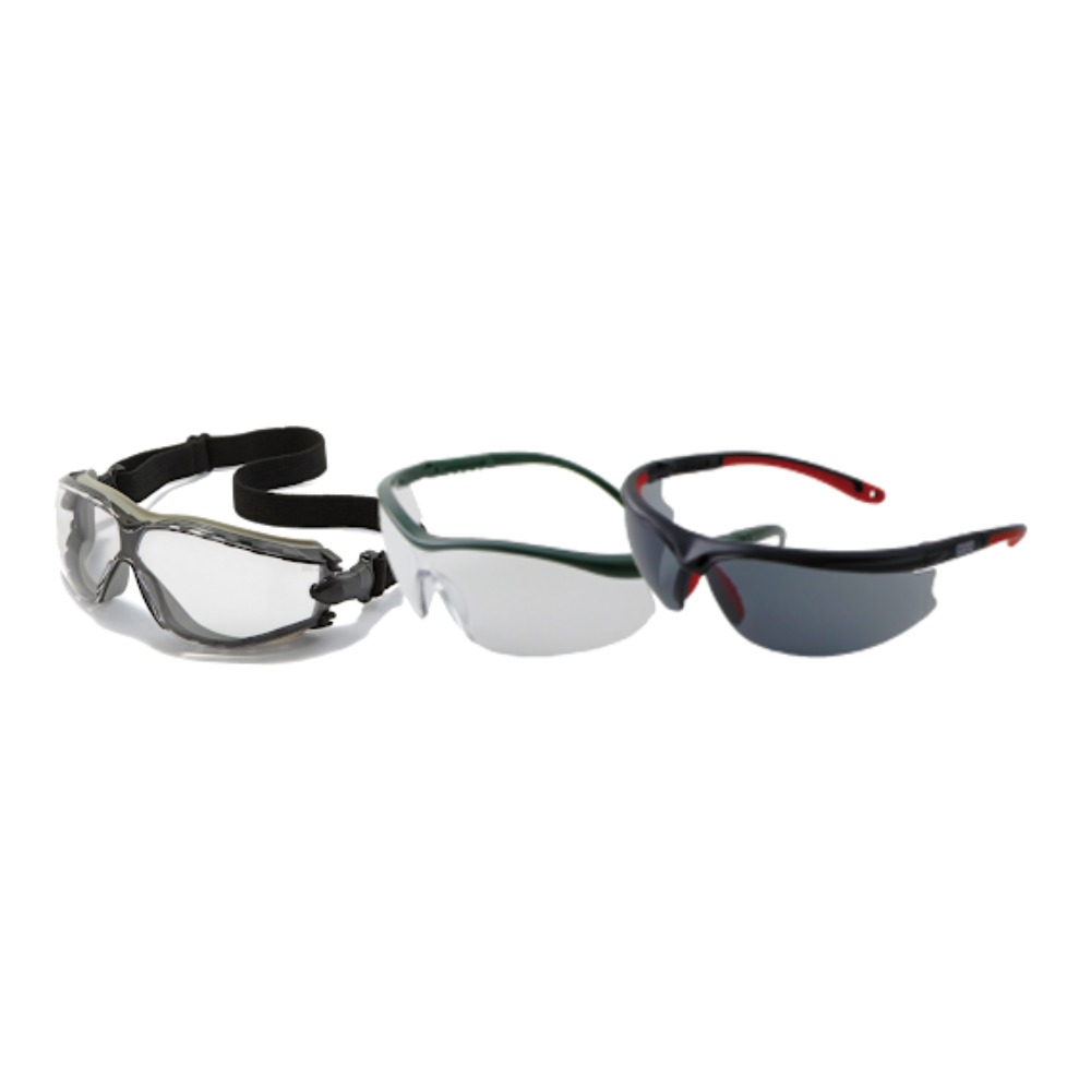 Gafas de seguridad: Lentes de policarbonato con diseño deportivo y protección UV, patillas de nylon con visión panorámica y lateral. Lunas claras y oscuras.